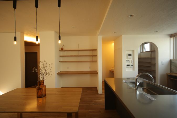 料理するすぐそばでお子様がお絵描きや宿題をしたり、調理の作業台にもなったり、大きなテーブルが生活の中心となり暮らしにに寄り添います